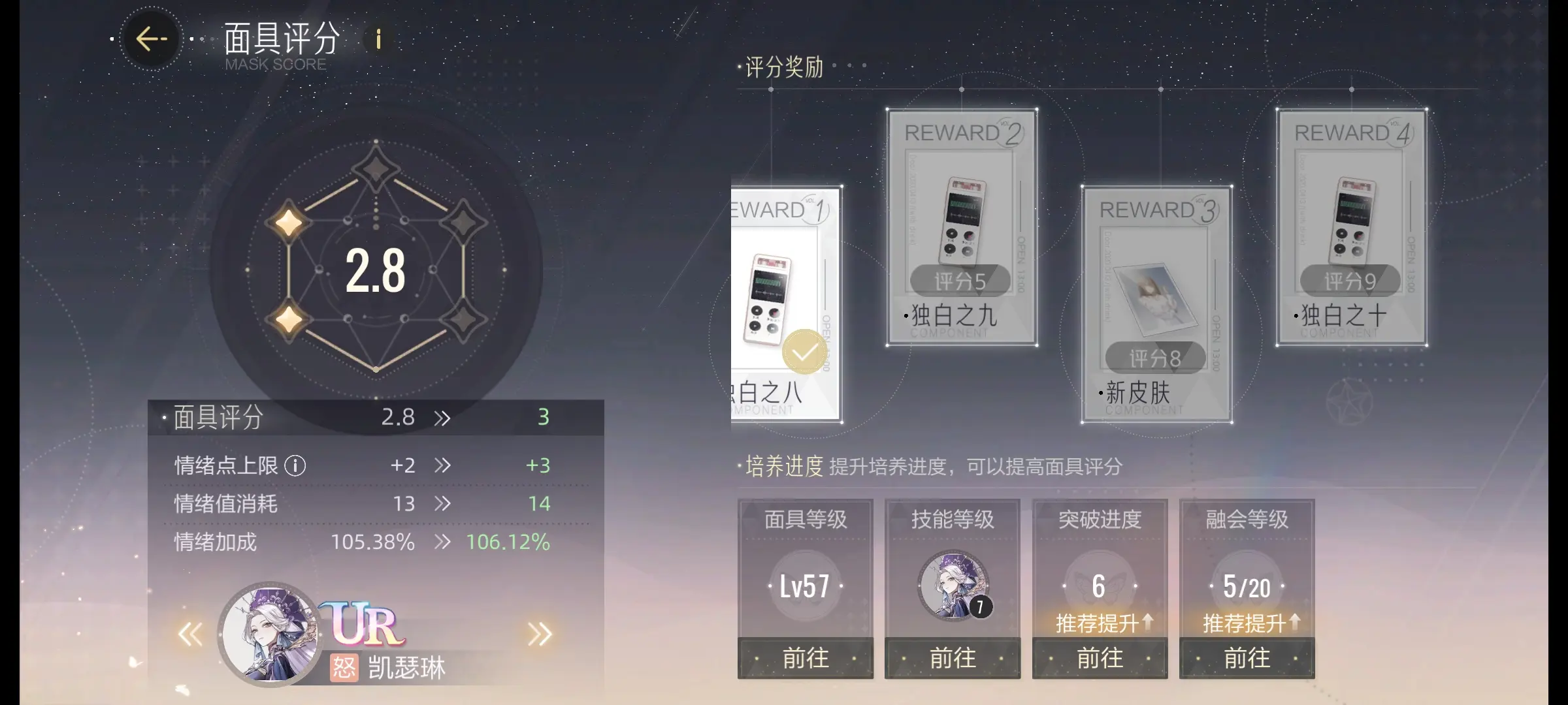 根据评分的等级会给予一些情绪加成,但总体来看还是一个厨力奖励,会给三条语音和一个新皮肤,升级方法就是前面提过的等级+技能+突破+融会,尽力养卡获得新皮肤吧。