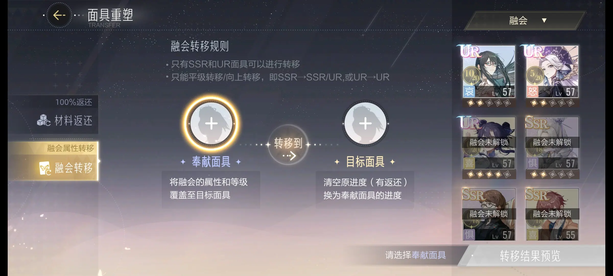 ③ 融会转移就是洗练出的数值,转移后会返还目标面具融会所消耗的所有材料,每次融会需要一个臻境交流,只能在商城用50星石购买获得。
