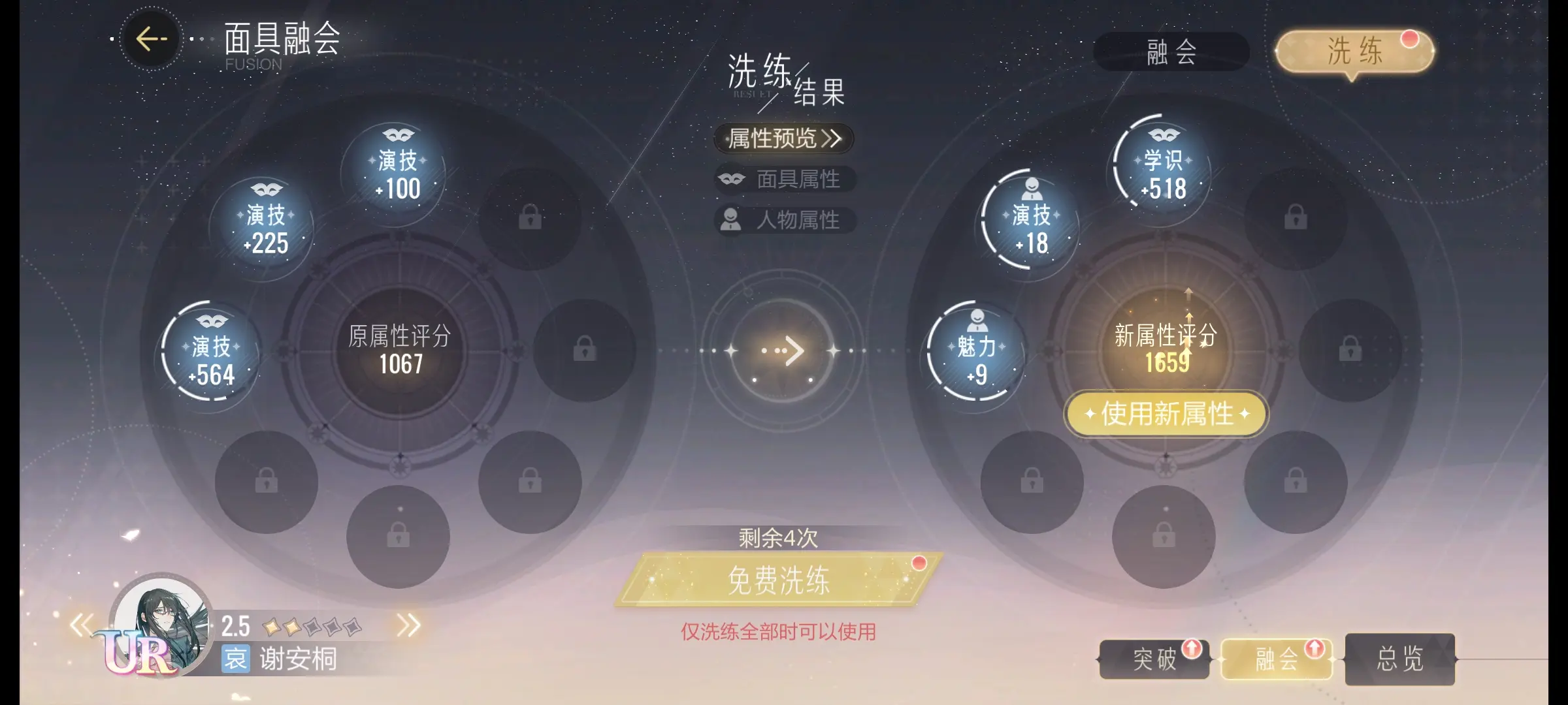 ② 建议融会全部结束之后再开始洗练,洗练基本会获得更高数值,如果下降不要替换,洗到好属性的时候记得替换新属性,每天有五次免费洗练的机会,后面就必须用星币洗练了。