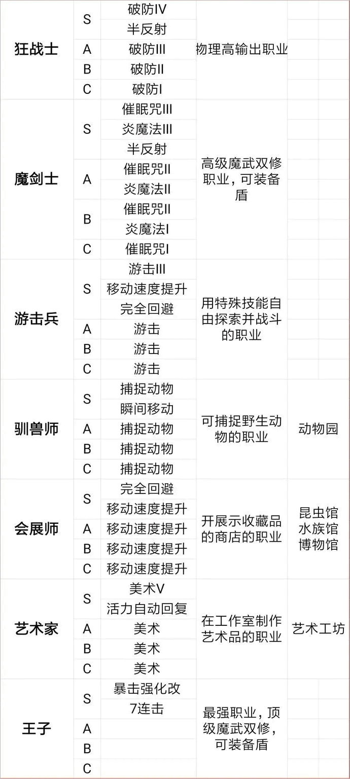 魔剑、狂战、游击、驯兽、艺术、会展、王子
