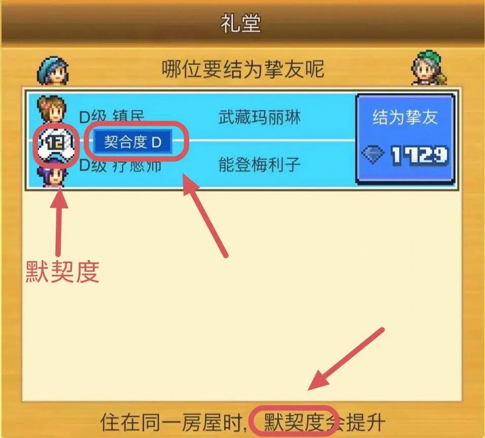 两个角色使用挚友床同居后,可以使用典礼官建造的礼堂结为挚友,默契度越高费用越少,满100默契度只需要4钻石,不能跨城结