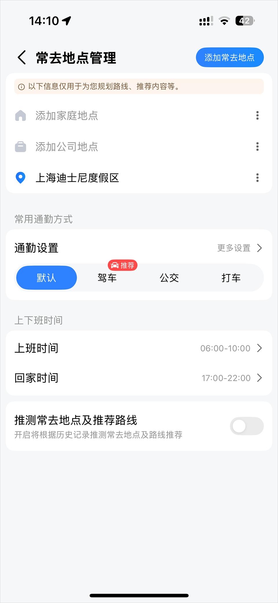 3、进入详细信息界面,在这里可以进行通勤设置,推测常去地点及推荐路线。