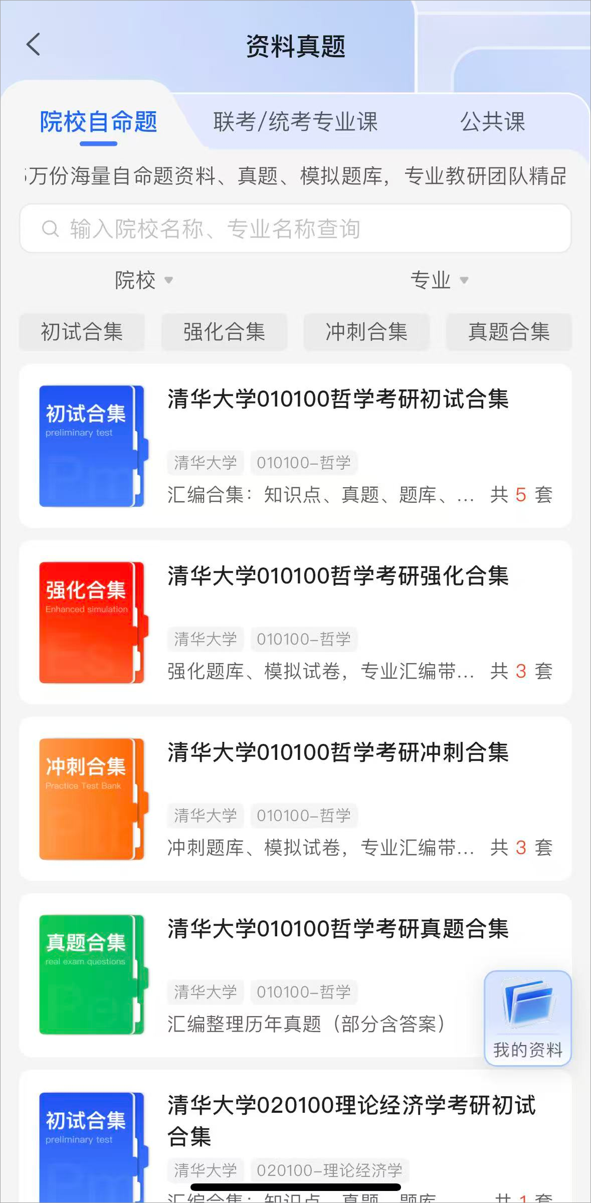 2、进入资料真题页面后可以选择不同学校的考试真题,还可以筛选院校自命题,联考/统考专业课,公共课等不同类型的真题