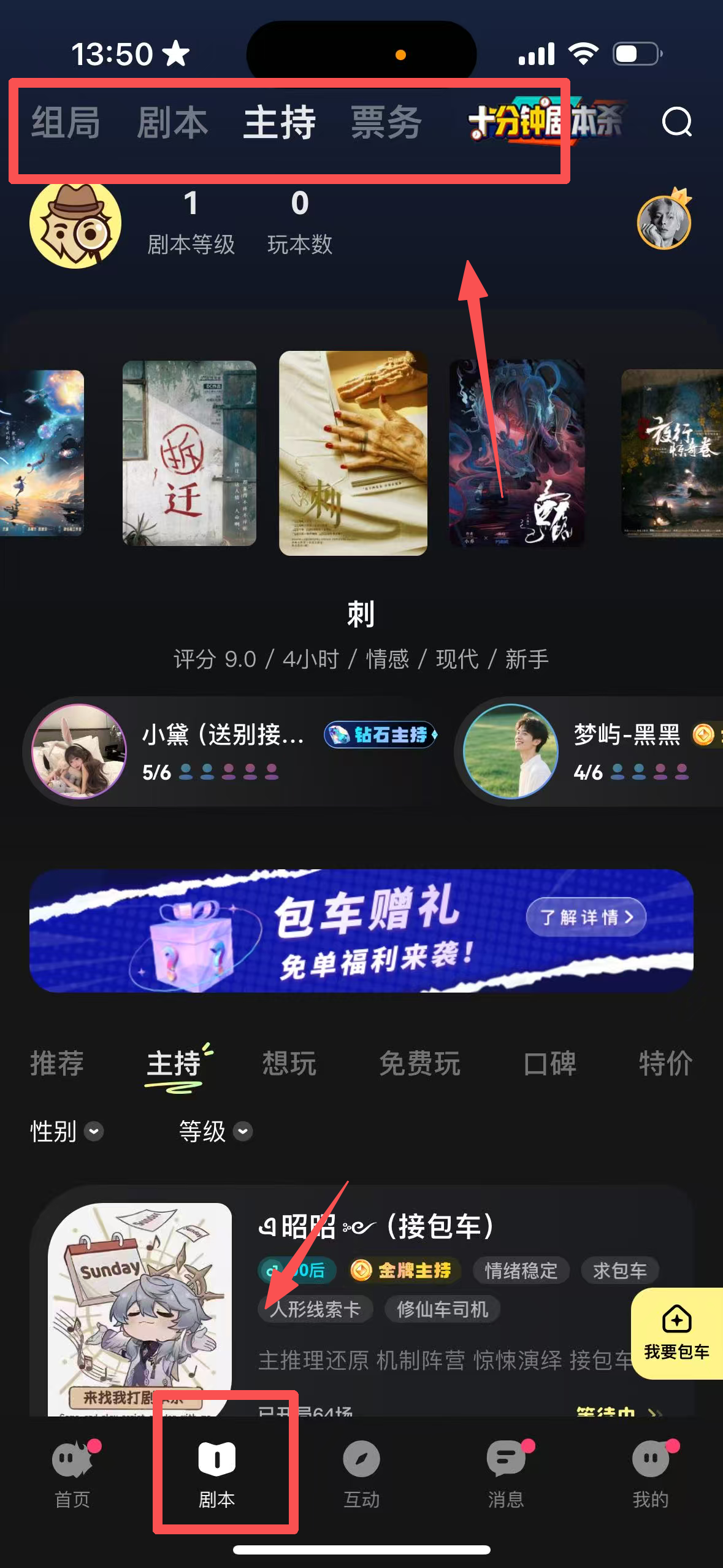 2、此外在主持页面点击右下角的“我要包车”,可以更快的筛选不同类型的剧本