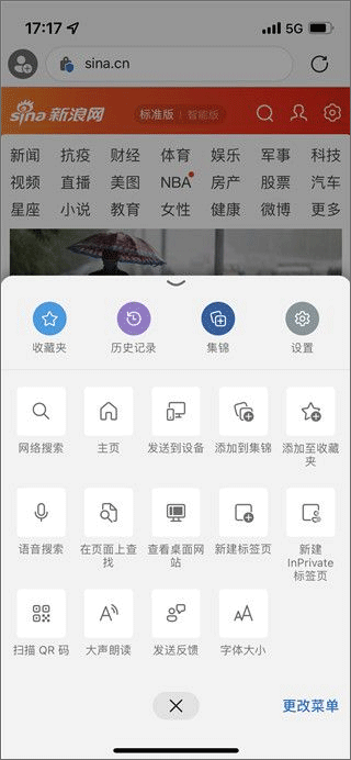 2、点击打开正文内容以后,我们就能在页面的最底部看到三个点的图标,点击此图标就能看到浏览器常用工具,比如下图一中的收藏夹、历史记录等,此外网上滑动还可以看到更加全面的工具,其中就有“大声朗读”这一项。