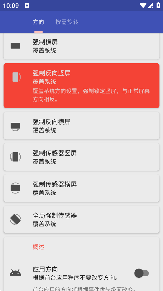 3、设置好配置后点击屏幕方向进行设置,可根据自己的需求来选择你进行强制横屏或竖屏