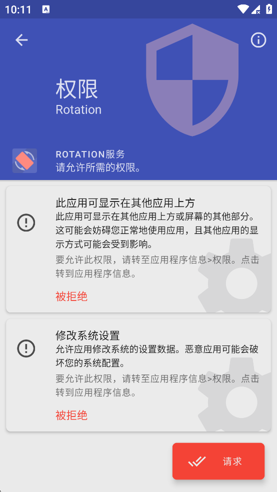 4、点击需要调整的屏幕方向,会看到设置所需要的权限,再点击请求去打开权限
