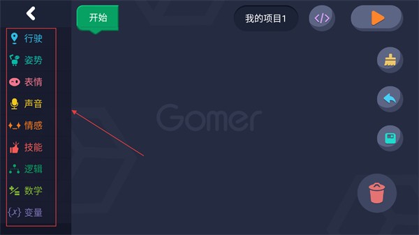 3、在项目编辑页面,可使用行驶、姿势、表情等功能模块进行编程创作。