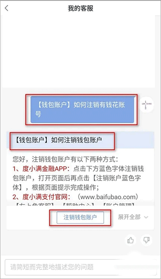 7、在“百度钱包”我的客服对话框输入“【钱包账户】如何注销有钱花账户”。然后再在机器人的回话中点击“注销钱包账户”。