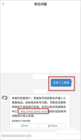 5、在对话框输入“百度人工客服”并发送。在机器人的回话中找到“百度服务中心”的链接,点击进入。