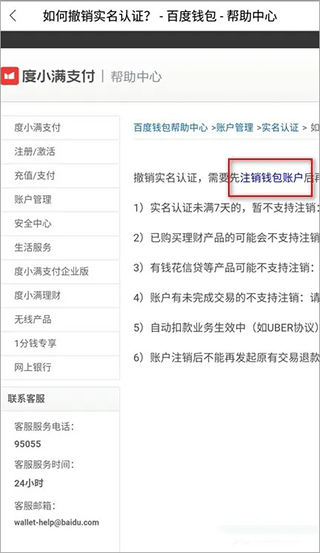 8、然后就会来到“帮助中心”,不要管它显示的是“如何撤销实名认证?”的问题。点击“注销钱包账户”的蓝色文本链接即可。