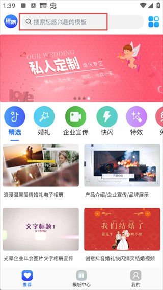 1、打开捷映视频制作App,主页将展示丰富多样的模板,可直接浏览或通过搜索栏查找您感兴趣的模板。
